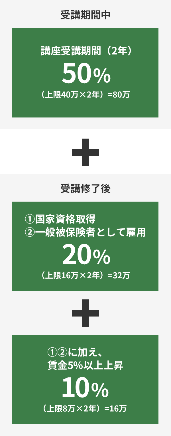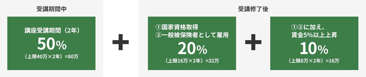 4月以降:国家資格を取得し、かつ終了日の翌日から1年以内に一般被保険者として雇用されると追加支給を申請できます。また、訓練修了後の賃金が受講開始前の賃金と比較して5%以上上昇した場合は、教育訓練経費の1割、年間上限8万円が追加で支給されます。