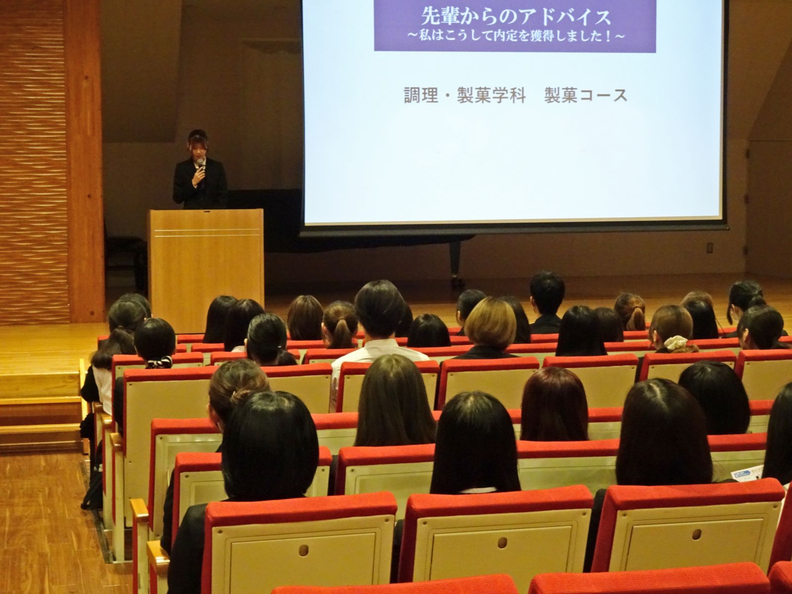 冒頭に、竹澤専務理事より「就職活動のスタート」について講話をいただき、就職部からは、就職活動の進め方や準備、就職部の活用方法について説明がありました。そして、早期に内定を獲得した2年生からは、就職活動における心構えとアドバイスについての発表がありました。