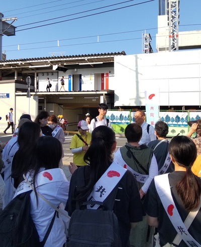 ノボリを立てタスキ、お声掛けをしながら「赤い羽根およびポケットティッシュ」を配布。阪急下新庄駅をご利用の市民の方に募金の周知と啓発活動をおこないました。