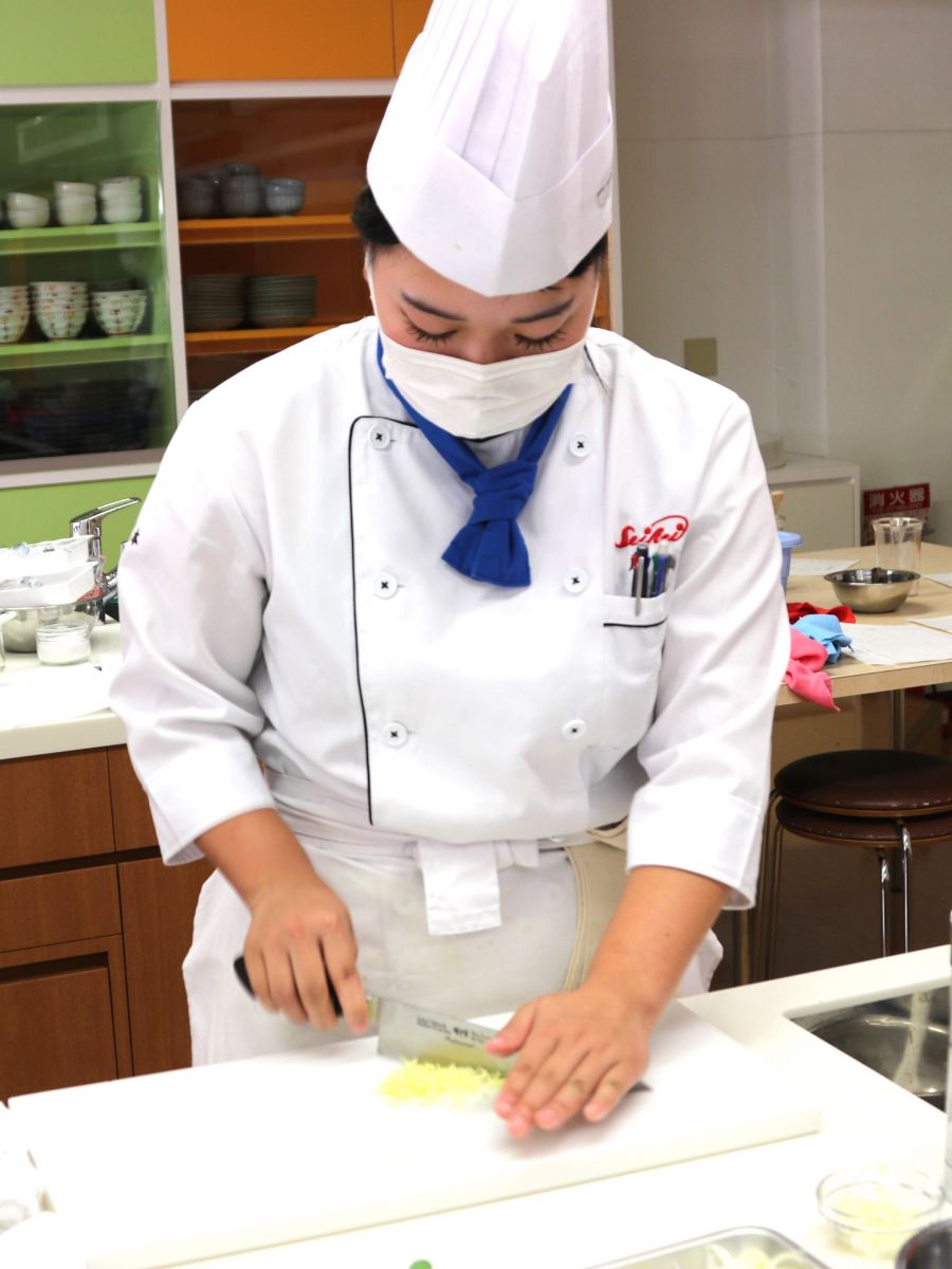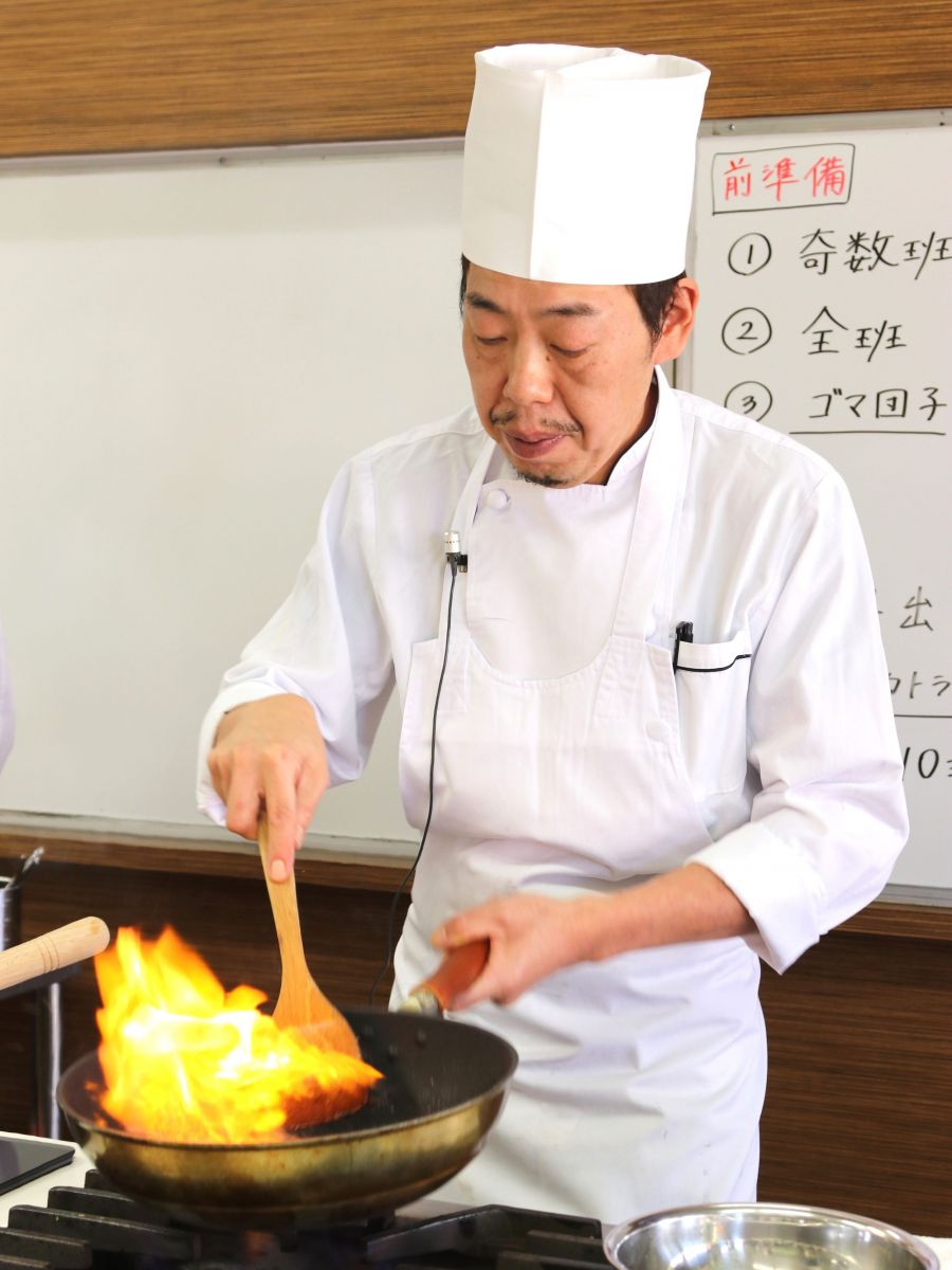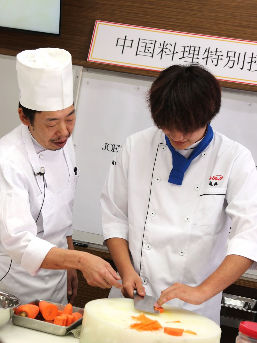 講習では、貴島氏による中国料理のデモンストレーションが行われ、「四川麻婆豆腐」、「油淋鶏」、「ゴマ団子」の作り方を丁寧にご指導いただきました。また、中華包丁での飾り切りの実演もしていただき、数名の学生が実際に挑戦しました。