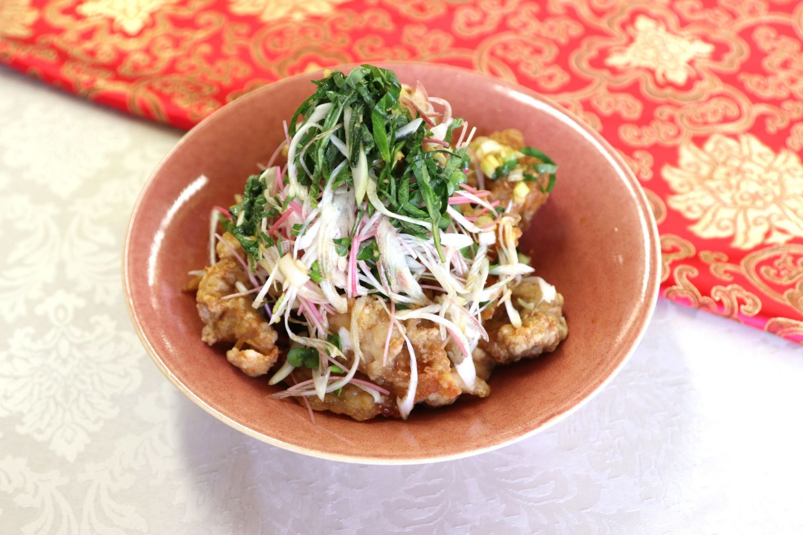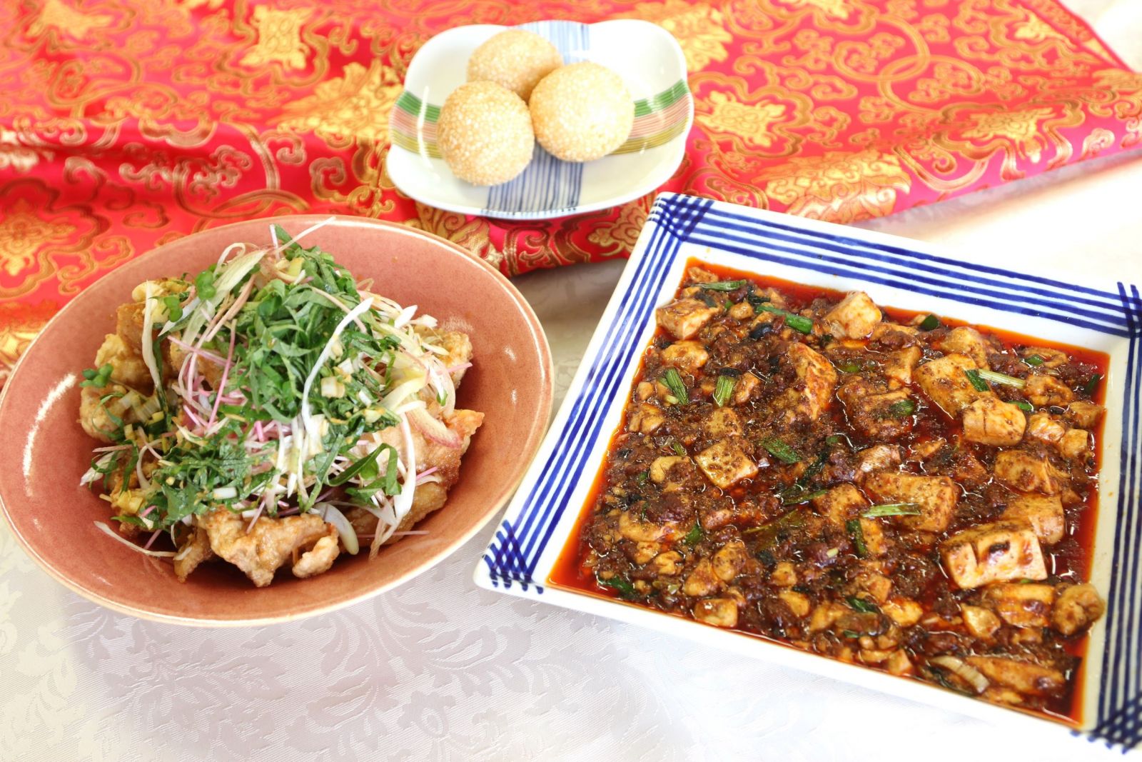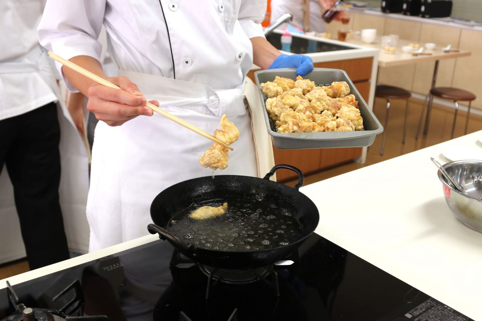 講習では、貴島氏による中国料理のデモンストレーションが行われ、「四川麻婆豆腐」、「油淋鶏」、「ゴマ団子」の作り方を丁寧にご指導いただきました。また、中華包丁での飾り切りの実演もしていただき、数名の学生が実際に挑戦しました。
