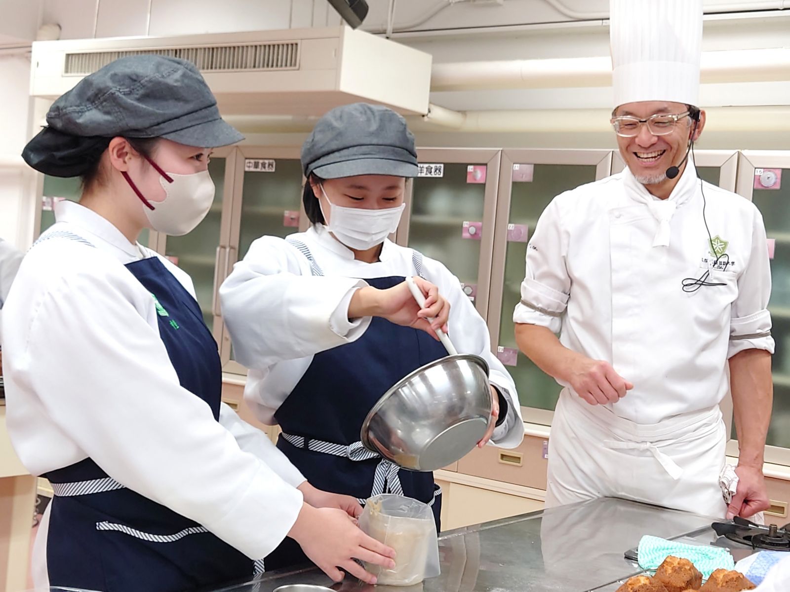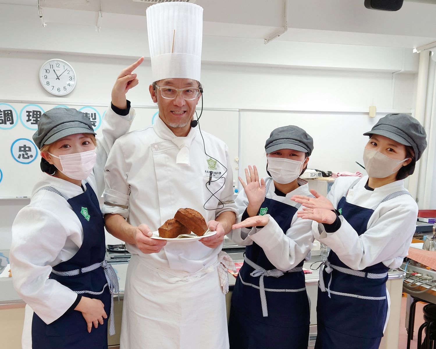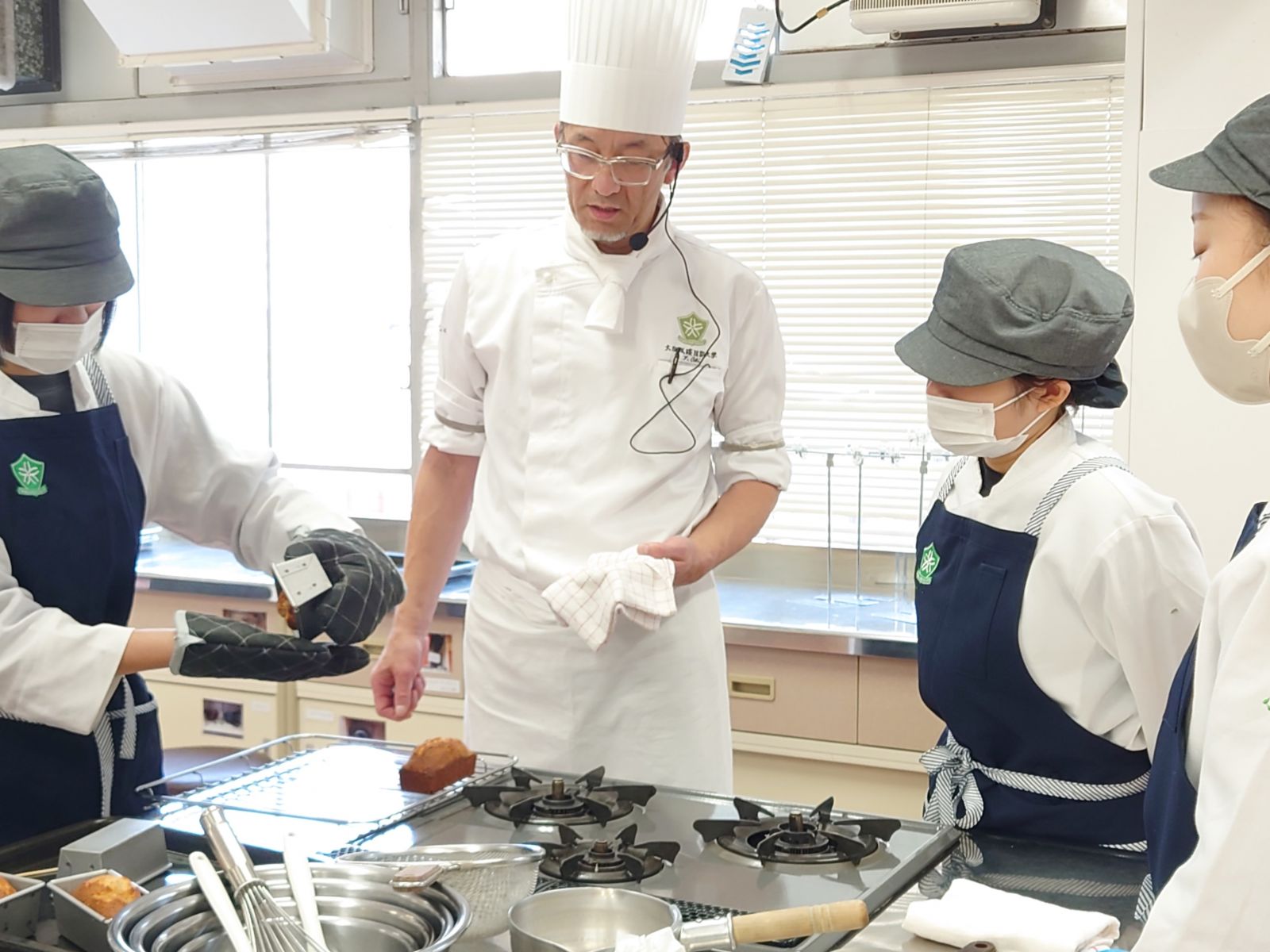 今回は、本学の調理・製菓学科 製菓コースの沖 忠浩教授を講師として迎え、パウンドケーキとフィナンシェの作り方をご指導いただきました。