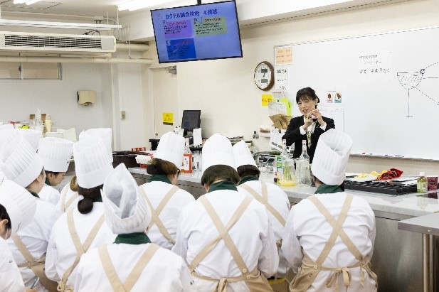 2025年11月5日(水)、調理・製菓学科 製菓コースでは2年生を対象に、バーテンダーである古澤 由美子氏を講師にお迎えして「バーテンダー特別授業」を実施しました。