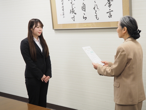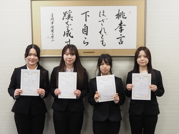 1月に実施された「大阪成蹊カップ プレゼンテーション大会」で優秀な成績をおさめた学生4名に、3月23日、副学長より表彰状が手渡されました。大阪成蹊カッププレゼンテーション大会は、「社会の課題に対して自分にできること」をテーマに学修の成果を発表するもので、内容や表現など7つの観点で審査されました。