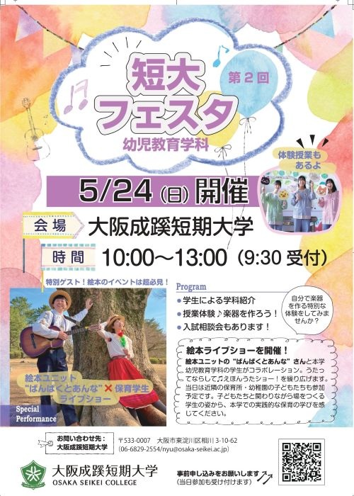 5月24日(日)に、大阪成蹊短期大学の魅力がたくさん詰まった「短大フェスタ」を開催します。 各学科では、それぞれの学びの特徴を活かしたさまざまなイベントを実施します。